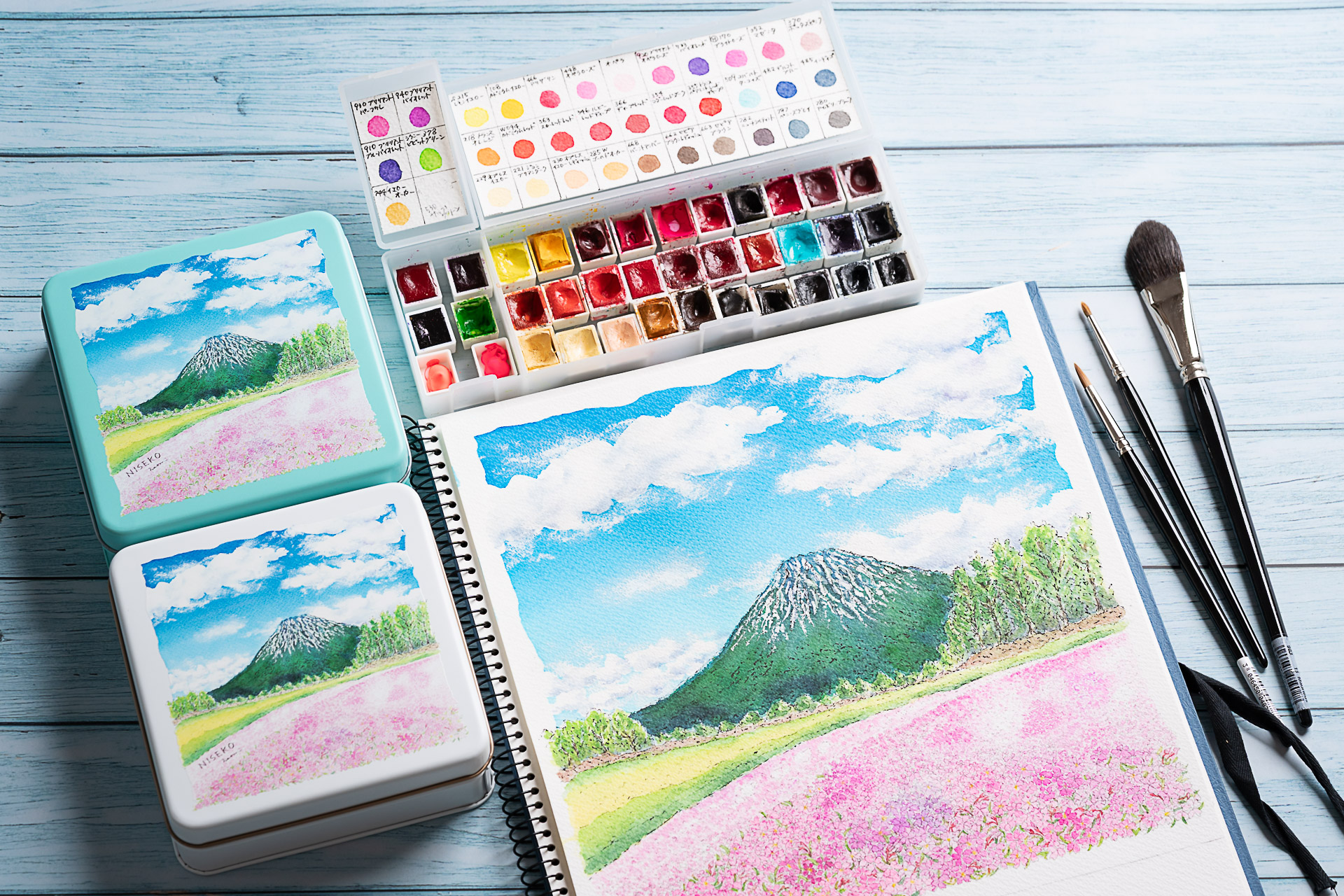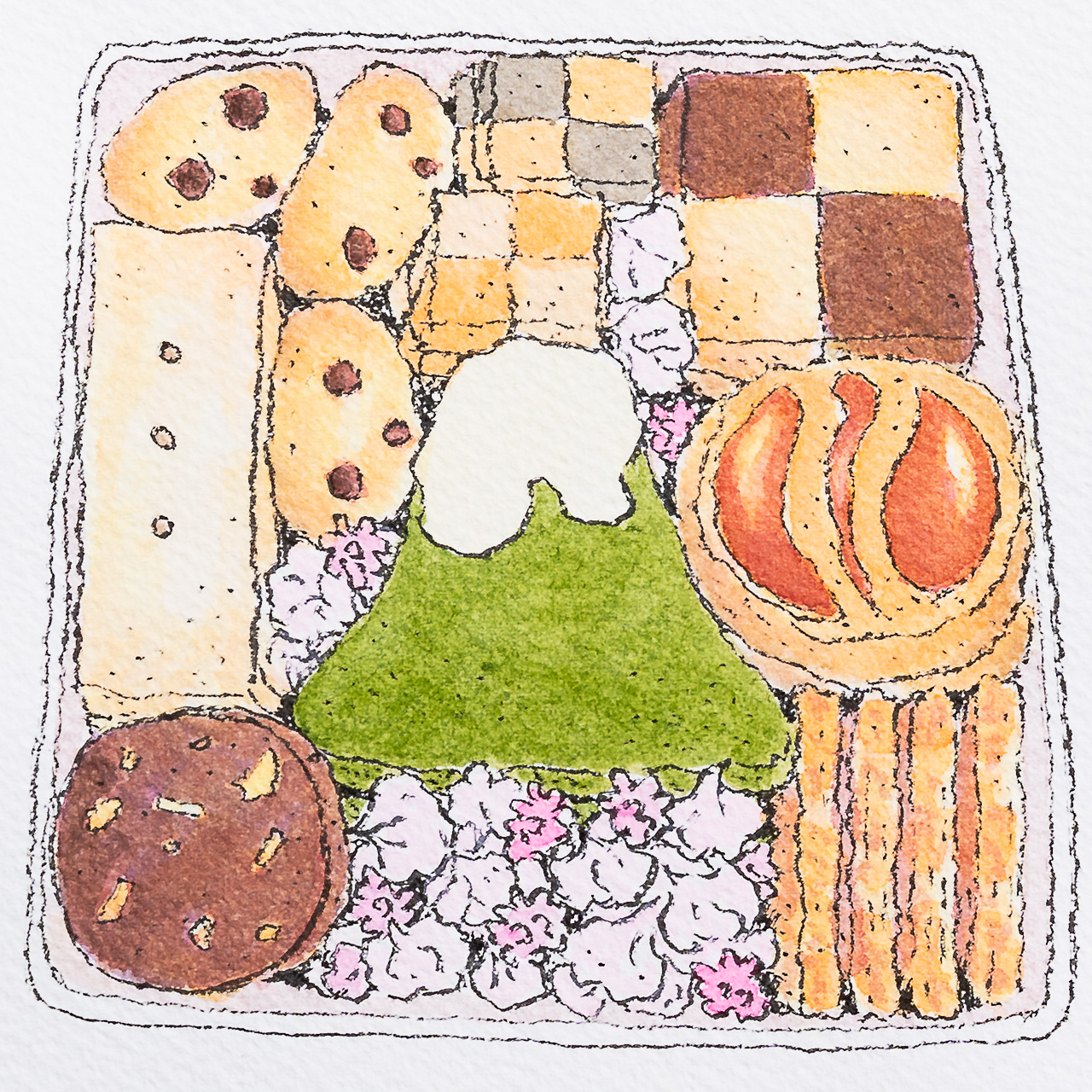 缶の蓋を開けたとき、目に飛び込んでくるのはまるで絵画のような美しいクッキーたち。羊蹄山(抹茶)と芝桜(いちごメレンゲ)をかたどったクッキーを中心に、様々な形と色合いのクッキーが並びます。これは「手に取ったときのワクワク感を継続できるように」というパティシエの思いから生まれたものです。