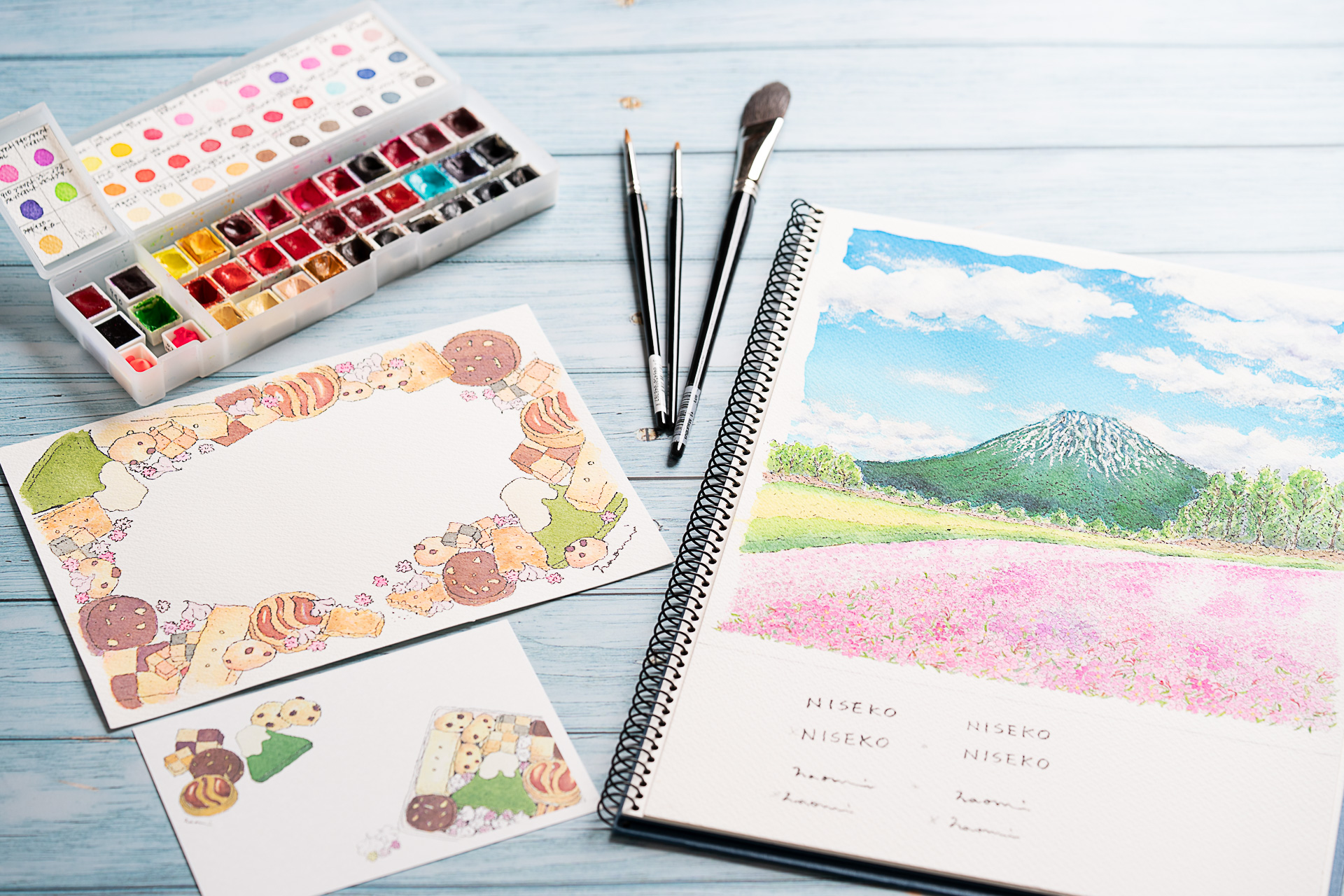 その後、約10年間を倶知安町で過ごし、四季折々の美しい風景やカフェなどを題材に、耐水性のペンで描き、透明水彩絵具で彩る独自のスタイルを確立。